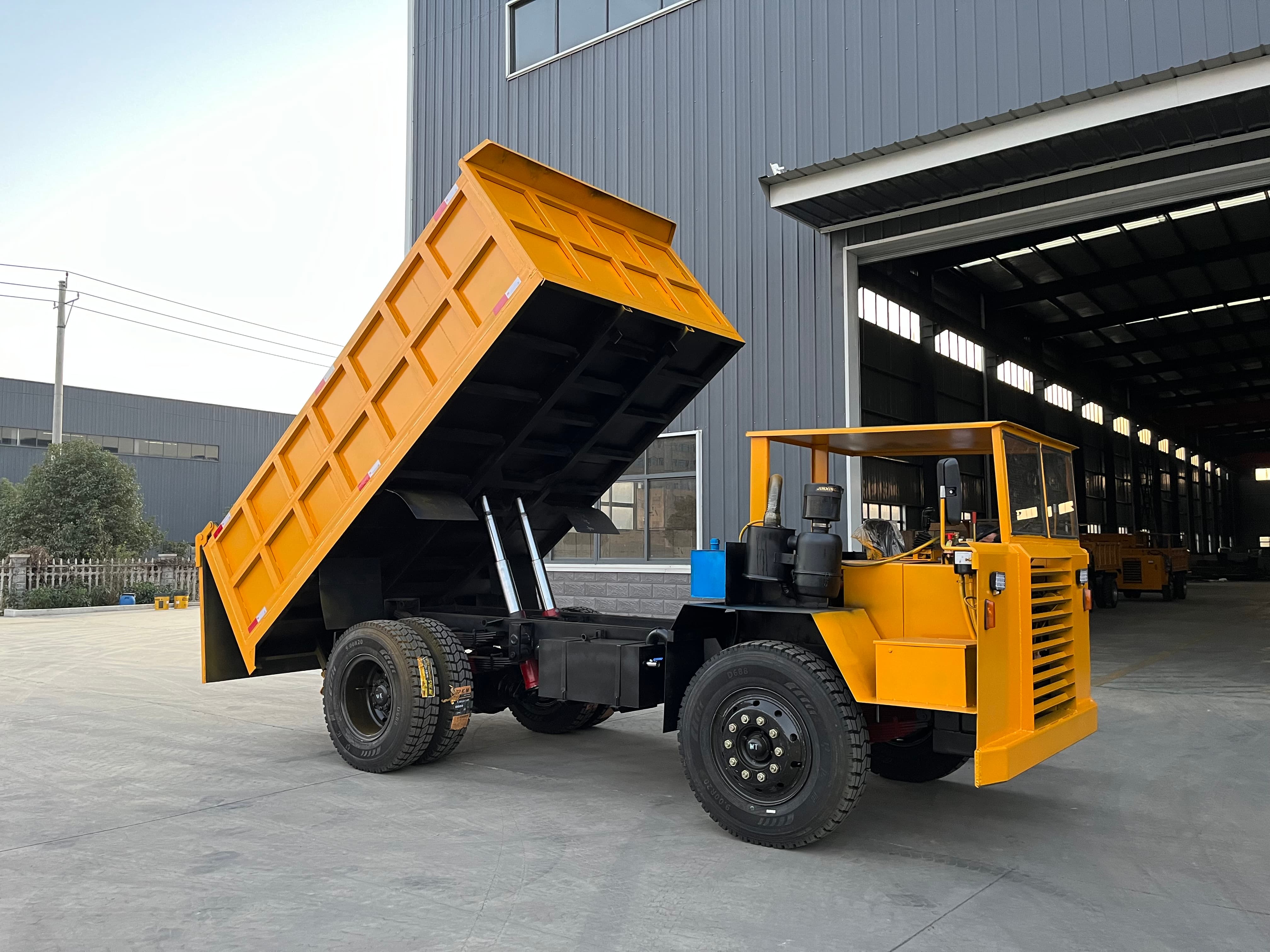 - 尺寸与通过性:整车尺寸为 595023502200mm,车厢规格 40002300800mm,底板 12mm + 边板 10mm 的加厚钢板(可定制),既保障了单次运输的大容量,又能在大型矿山的开阔巷道内灵活转向;配备 2 套前 900-20、4 套后 900-20 矿山轮胎,抓地力与耐磨性同步强化,适配露天矿场碎石、泥泞等复杂路面。