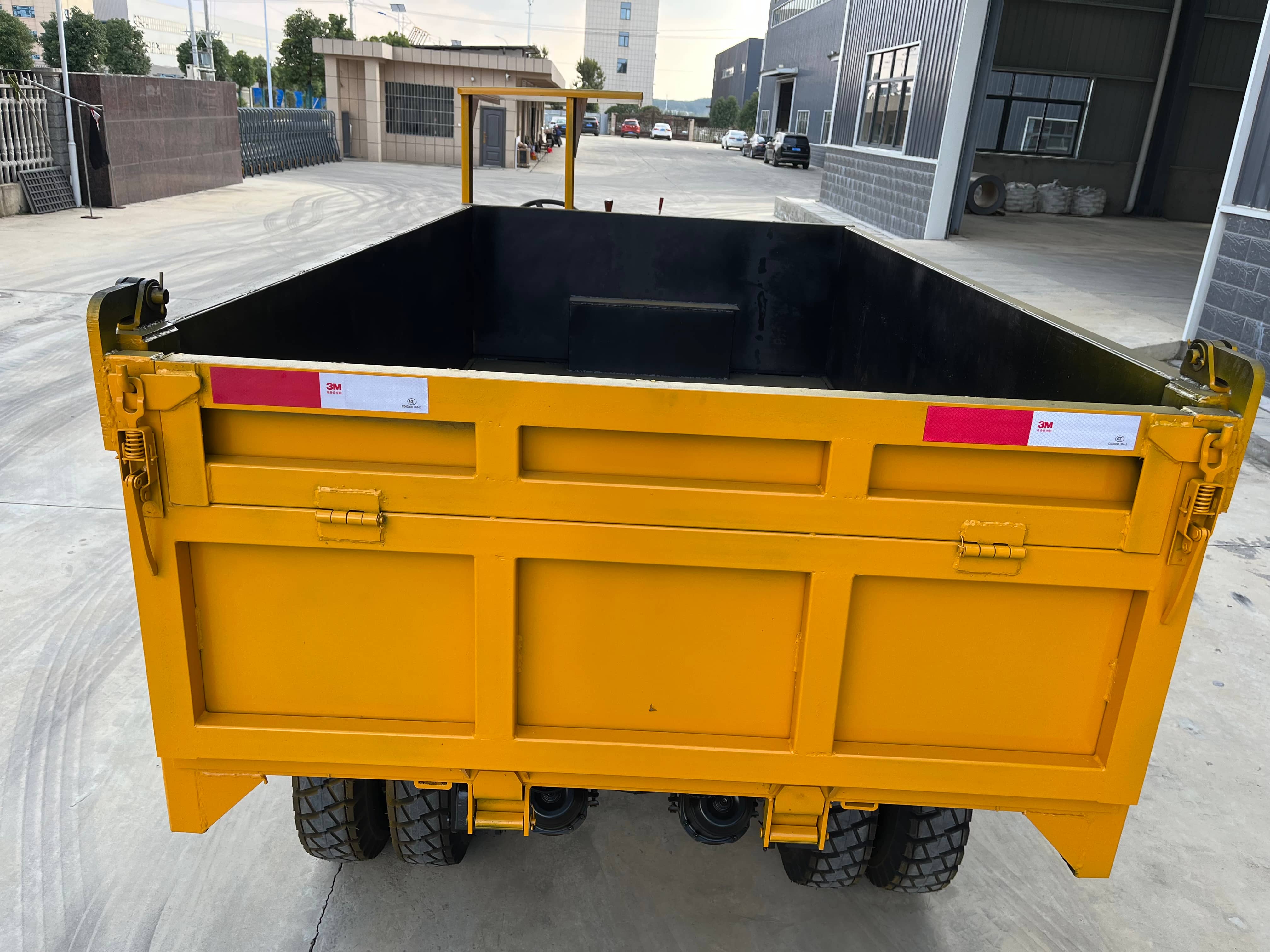 在窄巷适配与结构耐用性层面,该车精准契合中小型矿山的空间限制:整车默认尺寸为 400016501600mm(可按需定制),可顺利通行于 2.2m 以上净空的低矮巷道;前轮配备 2 套 650-16 矿山轮胎、后轮搭配 4 套 650-16 矿山轮胎,接地面积与抓地力同步强化,适配高频重载的复杂路面使用。同时,车厢默认规格为 26001600600mm,底板 8mm + 边板 6mm 的加厚钢板(厚度、尺寸均可定制),搭配 16080mm 矩形管车架、16 片 7513mm 后悬挂钢板,大幅提升了长期重载作业的结构强度,设备使用寿命较轻型矿用车延长约 30%。